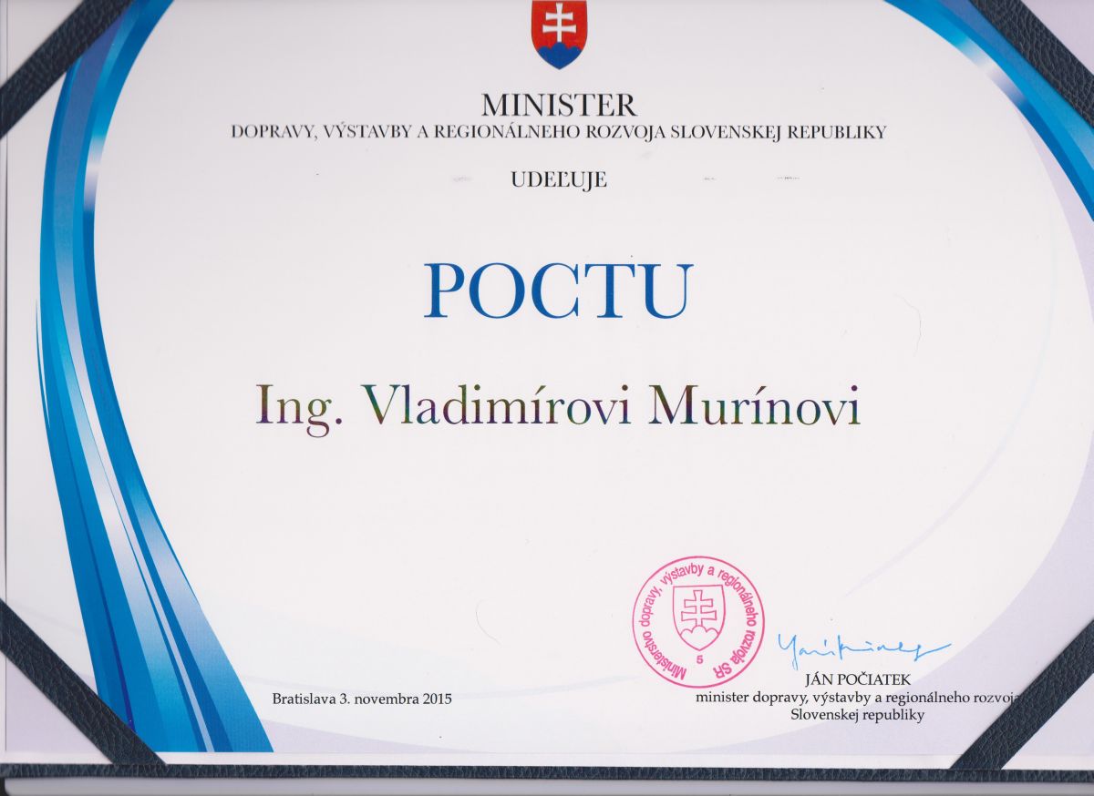 Dňa 3. novembra 2015 v hoteli Bôrik z rúk štátneho tajomníka ministerstva dopravy, výstavby a regionálneho rozvoja Viktora Stromčeka prevzali rezortné ocenenie pocta ministra, titul ministra zaslúžilý zamestnanec a uznanie ministra za zásluhy o rozvoj rezortu 53 jednotlivci.